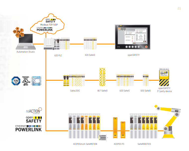 Safe shutdowns don’t necessarily mean a complete machine stoppage. A safe and intelligent response to various situations provides safety without halting production. B&R’s intelligent, decentralized, and integrated safety technology, with its very short response times, opens up a new range of safety concepts for machines and systems. A comprehensive selection of machine options, a programming-based rather than wired approach, safe maintenance and diagnostics, and secure system-wide communication combine to optimize both the flexibility and availability of machines and systems.